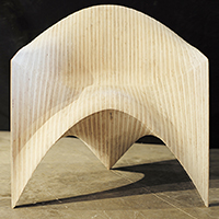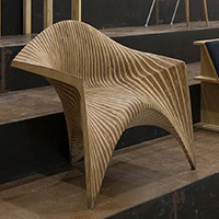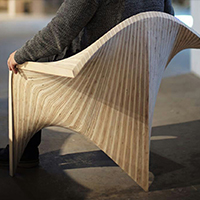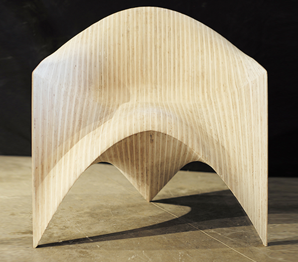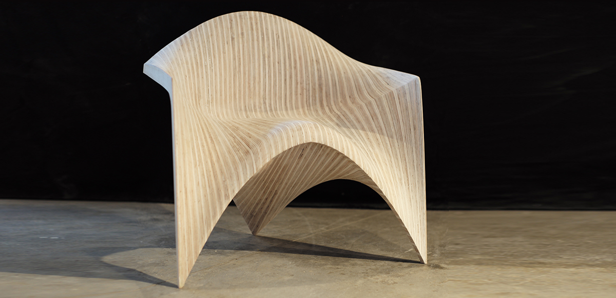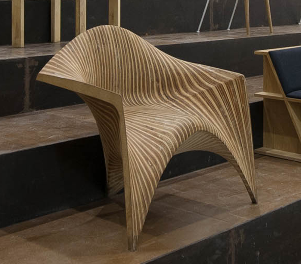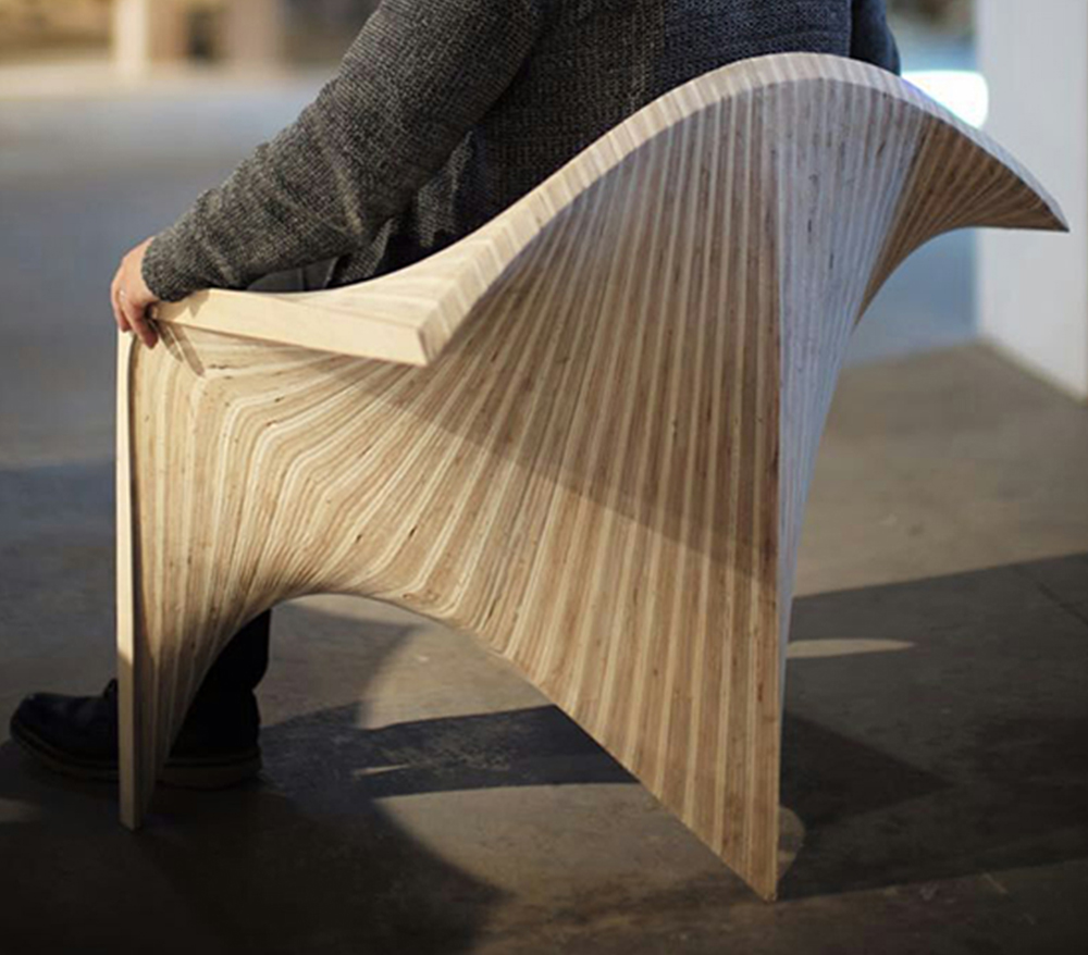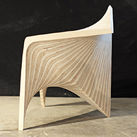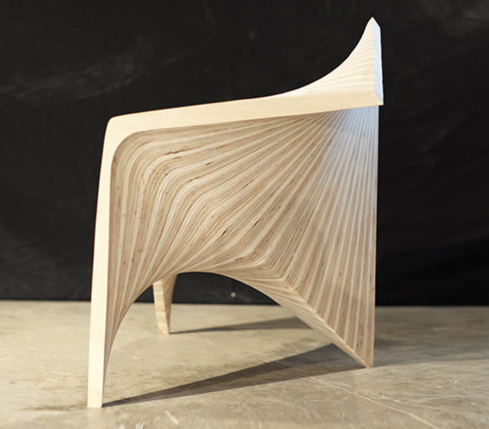 边锋椅,作为使用者与建筑之间的次级媒介,将建筑几何的定义向人体尺度进行拓展,在形式性能和物质建 构两个方面探讨了人体与几何、机器生产和个性定制之间的互动关系。在几何性能化方面,设计以曲面边缘作 为几何操作的核心,将座椅的支撑、坐垫、扶手和靠背整合在连续的光滑曲面之中,通过座椅边缘对人体坐 姿的回应,建立起人体工程 学与几何形式之间的联系。在建构过程中,机器人作为 加工媒介对木料进行等高线边缘切割,将木材的“柔软” 特性最大化,实现了人体触 感与木材表面完美贴合的同时消除了个体偏好与批量生产之间的矛盾。